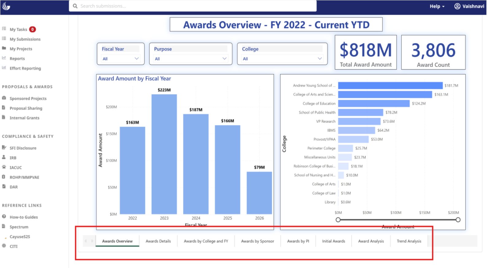 | Awards | Awards Overview Award Details Award by College and FY Award by Sponsor Award by PI Initial Award Award Analysis Award Trend Analysis |