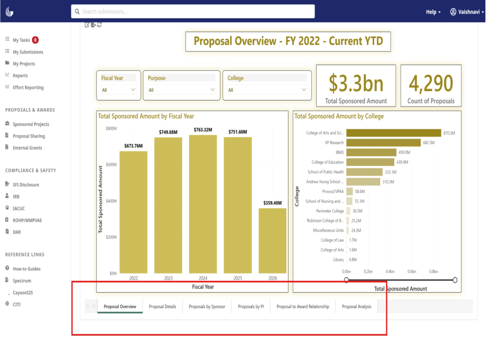 Navigate across pages using the tabs below, with color themes for easy recognition: Gold = Proposals, Blue = Awards, Green = Expenses.