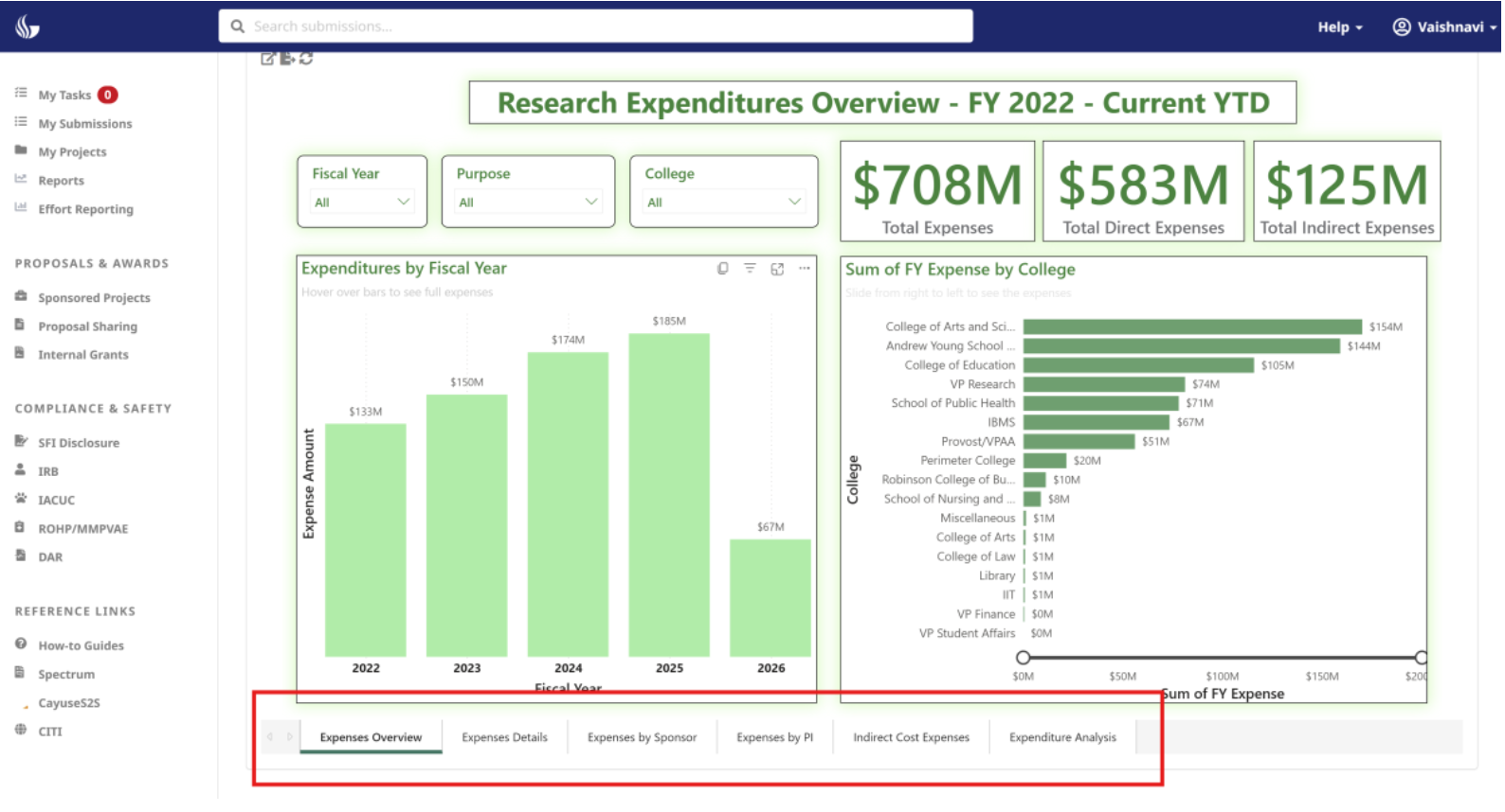 | Expenditure | Expenses Overview Expenses Details Expenses by Sponsor Expenses by PI Indirect Cost Expenses Expenditure Analysis |