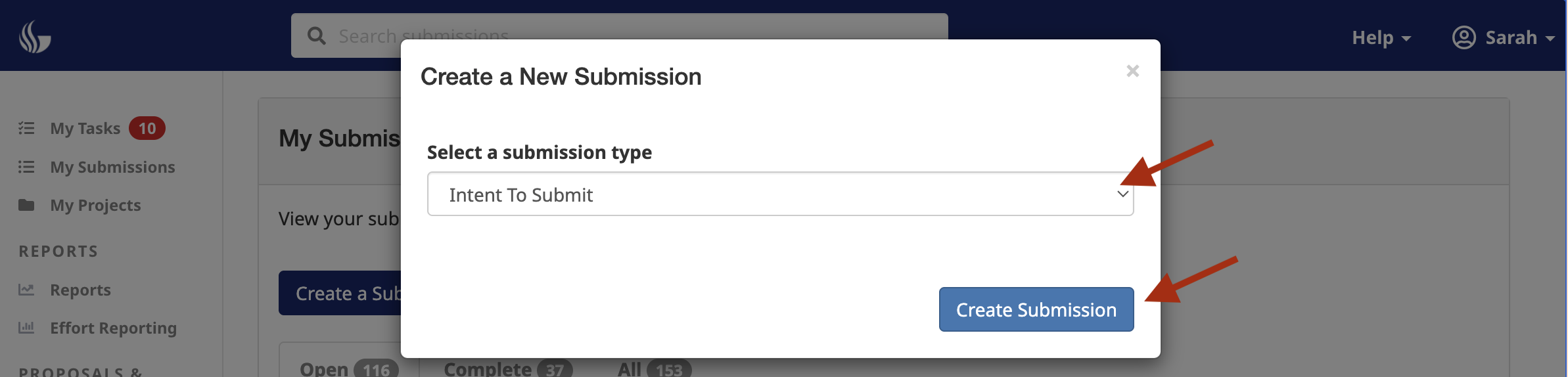 Select Intent to Submit option form the dropdown and select the Create Submission button. You'll be redirected to a new form: